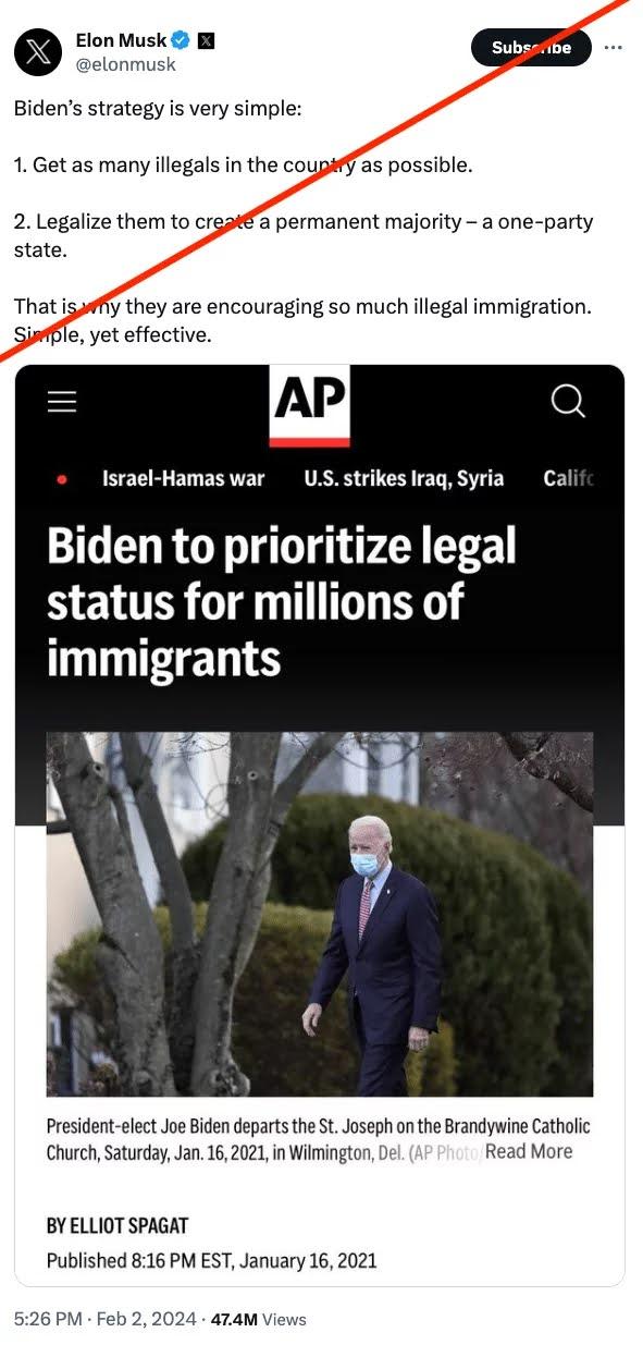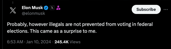 1月10日,马斯克在回复一篇关于近期无证移民涌入的帖子时,错误地宣称:“非法移民在联邦选举投票中不会被阻止,这让我很吃惊”。在那几天前,马斯克暗示拜登和民主党人在移民问题上松懈,因为“他们在输入选民”,这与川普几乎在同一时间分享的“大取代”阴谋论相呼应,该阴谋论声称欧洲裔白人正被故意换成非白人。