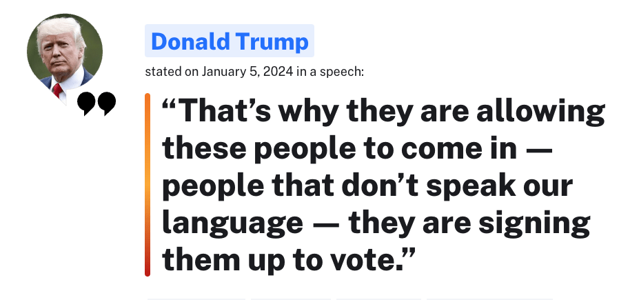 川普1月5日在爱荷华州党团会议投票前说:“这就是他们允许这些人入境的原因——  这些人不会说我们的语言——  他们要让他们登记投票。……我相信这就是为什么有数百万人涌入我们国家,这很可能会影响下一次选举。这就是他们这样做的原因”。