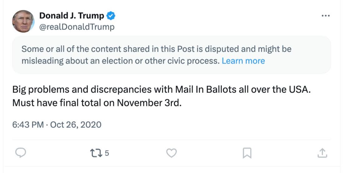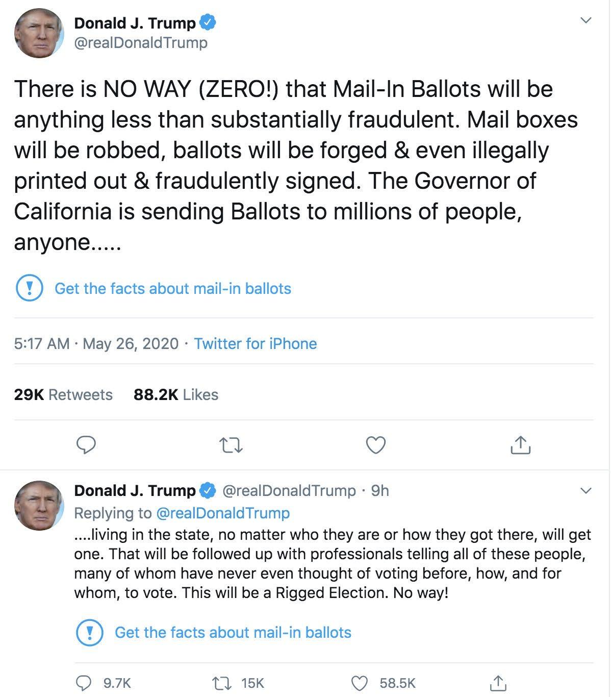 2020年5月,时任总统的川普在推特上发推警告说,增加对邮寄选票的依赖将导致“操纵选举”。推特当时的核查系统马上就对他的两条相关推文贴上了警告标签,提示用户阅读核实文章。这标志着推特首次在自己的平台内对总统进行事实核查。