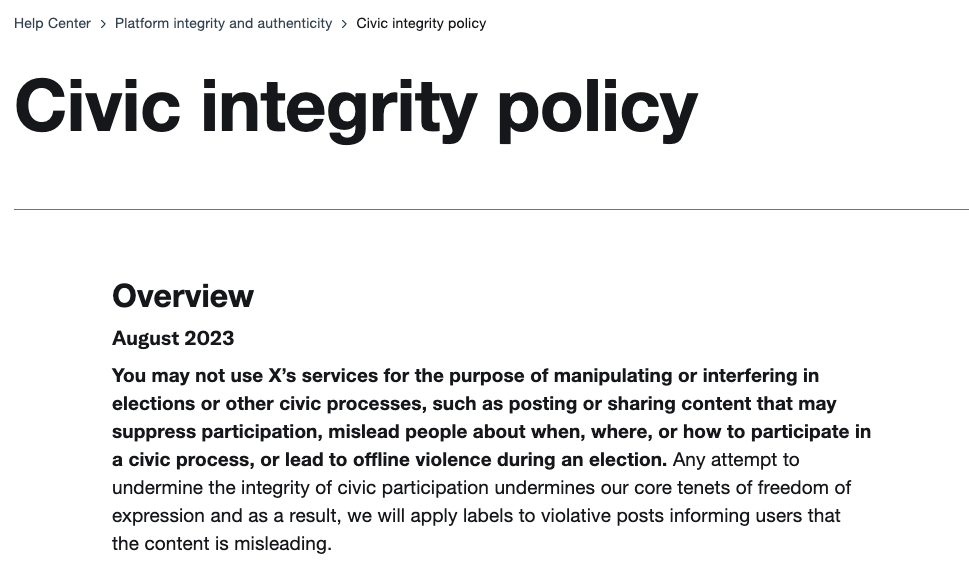 2020年,推特的“选举诚信中心”(Election Integrity hub)与外部团体和政治竞选活动保持着畅通的联系。该中心要么删除带有误导性信息的选举推文,要么为其增加上下文注释。