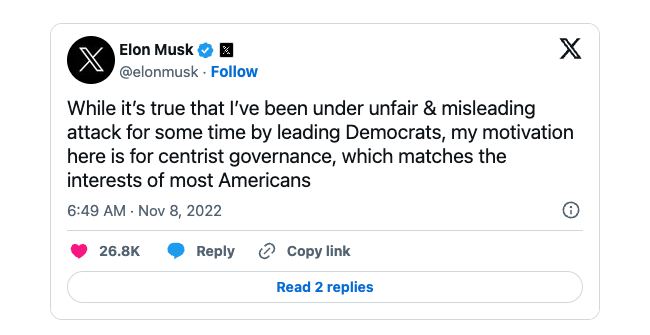 在接管推特后,马斯克取消了该平台标记虚假选举信息的系统,认为这等同于干预选举。同时还要求技术团队广为传播他自己发的推文。现在他在推特上散布跟川普如出一辙的说法,声称美国选举中存在大规模舞弊和非公民非法投票的现象。