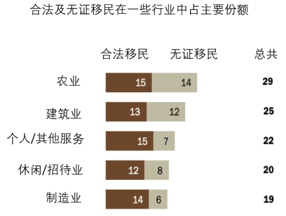 我们直接看数据吧,无证移民在很多基础行业和职业中的比例占到 10% 到 40% 不等。
