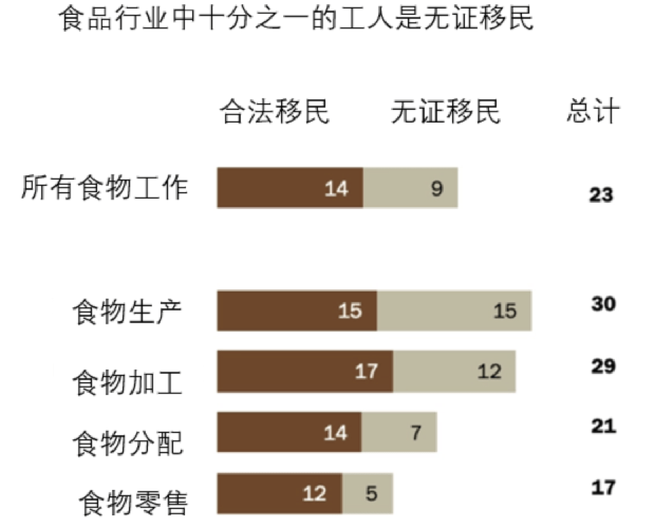 还有大约 75 万未获工作许可的移民在生产和分配食品的行业中工作。在全美食品工业的近 820 万工人中,合法移民和无证移民合计占近四分之一(23%),未获工作许可的移民占这些食品行业工人的 9%以上。