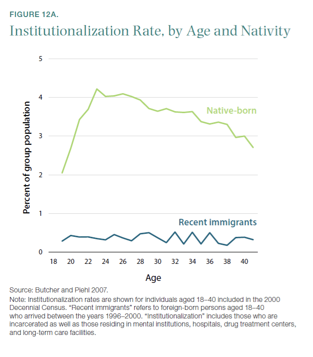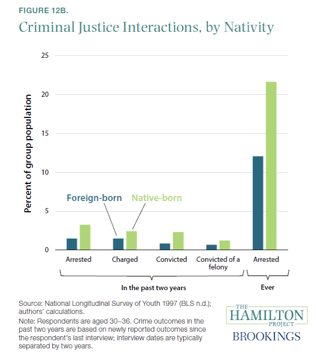 在刻板印象中,无证移民或者 “难民” 往往被渲染为犯罪频频的负面形象,但相关数据却显示,美国移民犯罪或被监禁比本地人比例小得多,也就是说,移民根本就没有给美国带来更多犯罪,反而从整体上降低了犯罪率。