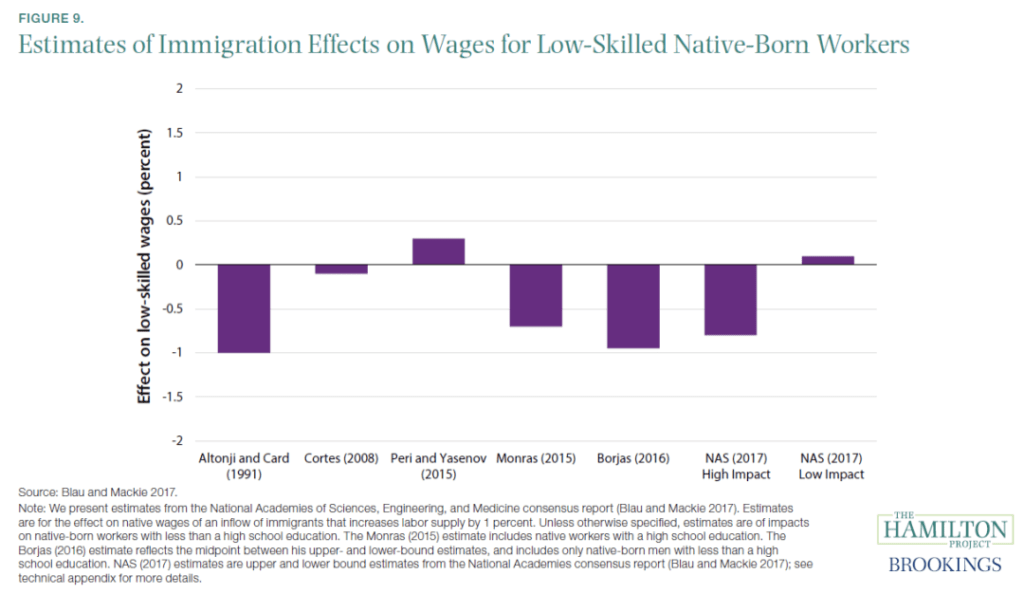 据华盛顿智库布鲁金斯学会的专家对移民如何影响经济的研究,无证移民劳工对本地出生工人的工资影响很小。无论哪个国家,无证移民通常都是从事本地人不愿做的令人不愉快的,艰辛的工作。在美国也是一样,无证移民工人所从事的许多工作,都是多数美国人不想做的辛苦工作,例如清理鱼内脏,或在农田上工作。