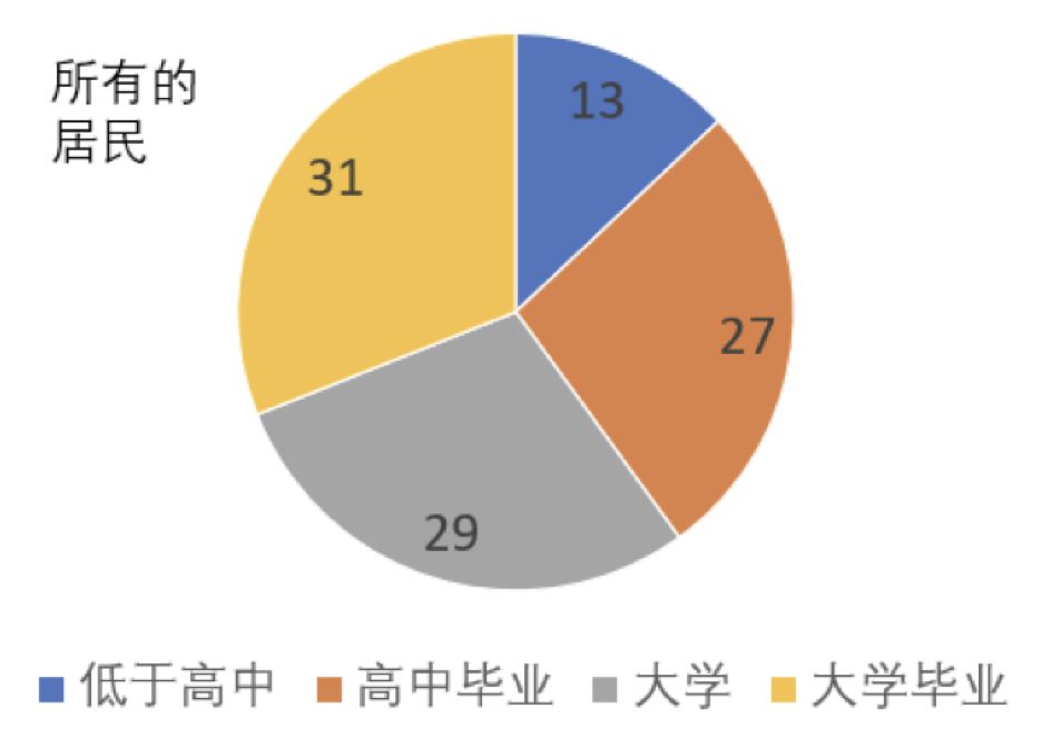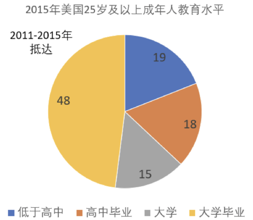 新移民成年人中的大学毕业生比例已经超过了美国大城市的成年人。在本地生活的移民家庭中,移民获得本地教育的学历比本地出生父母的孩子高 4 倍,获得博士学位的几率几乎是本地人的两倍。
