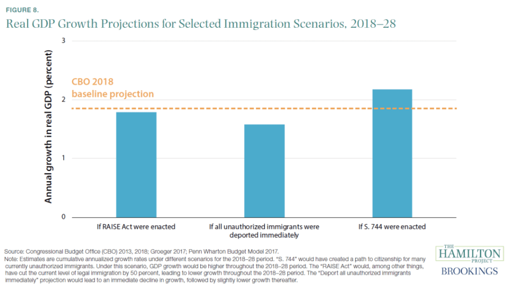 勿庸讳言,从短期来看,移民数量的大幅增加很可能会造成混乱。例如会使现有的基础设施不堪重负,或者可能会给本地出生的工人带来工资暂时下降的压力。而如果将现有的无证移民全部赶出美国,按照国会预算办公室发布于 2013 年的 GDP 数据,2017 年宾夕法尼亚州沃顿预算模型,那么将会在同一时期降低 0.27 个百分点的年度 GDP 增长。