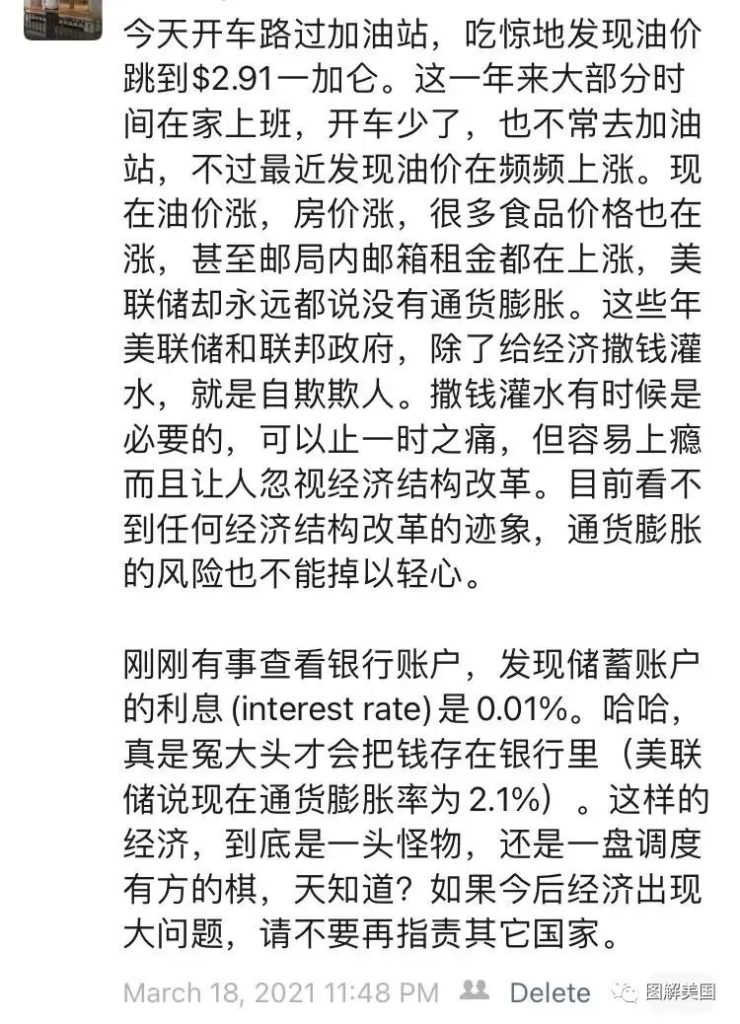 去年3月份我在微信朋友圈写了个短帖,感叹当时”油价涨,房价涨,很多食品价格也在涨,甚至邮局内邮箱租金都在涨。” 尽管当时官方公布的通货膨胀率仍然很低(大约2.1%),但我已经预感到通货膨胀压力上升的风险(见截屏1)