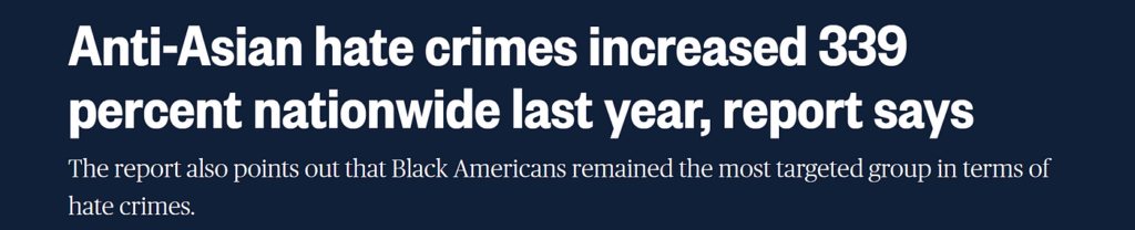 根据仇恨与极端主义研究中心(Center for the Study of Hate and Extremism)汇编的数据,2022 年反亚裔仇恨犯罪增加了 339%。全国各地发生的针对亚裔的残暴袭击事件成为全国性新闻的头条。当川普总统将新冠称为 “中国病毒 “时,反亚裔的仇恨情绪变得十分突出。