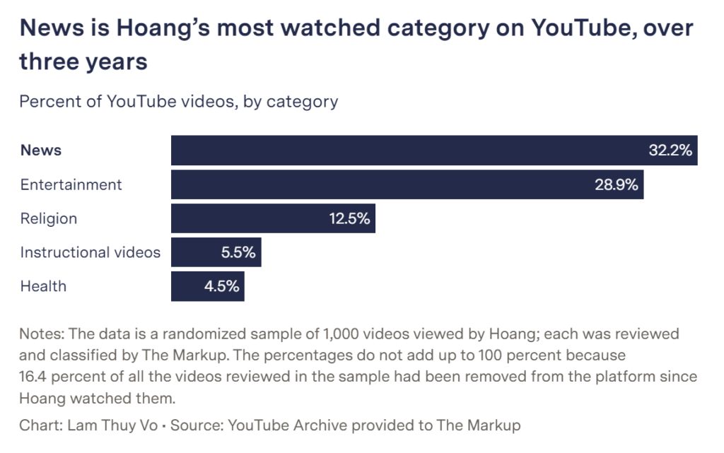 通过在“越南事实核查”的工作,阮也看到了YouTube在讲越南语的美国人获取新闻的方式中如何占据了主导地位。“他们大量的新闻和媒体消费来自YouTube。因此,当你没有从其他来源获得[高质量]信息时,其危害实际上是相当严重的,”阮说。
