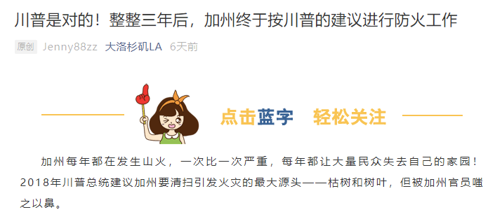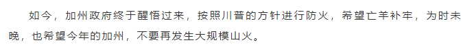 通过阅读英文原文,我们可以发现,加州采取的策略,是砍掉一些树木,来达到缩小森林面积的目的。跟川普所提倡的扫地面上的树叶,完全是不同的两回事。而且英文文章里明确指出了跟川普提议的措施是完全不同的。该篇网文置事实于不顾,还反过来说加州是按照川普的措施来进行森林防火,符合右翼抹黑左翼的一贯讨论,属于非蠢即坏。见到这类公号,最好的办法就是直接取关。