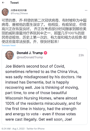在拜登于7月30日二次检测新冠为阳性后,川普于自己的社交平台Truth Social上发表评论: