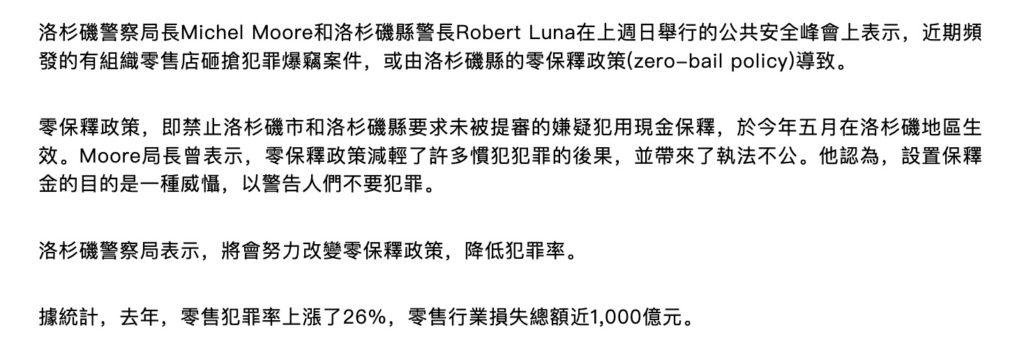 首先聚焦洛杉矶,最近该县只要出现了零售业的砸抢盗窃事件,一些媒体和警务人员就会将之归咎于“零保释金”,但他们的指控并没有数据支持。