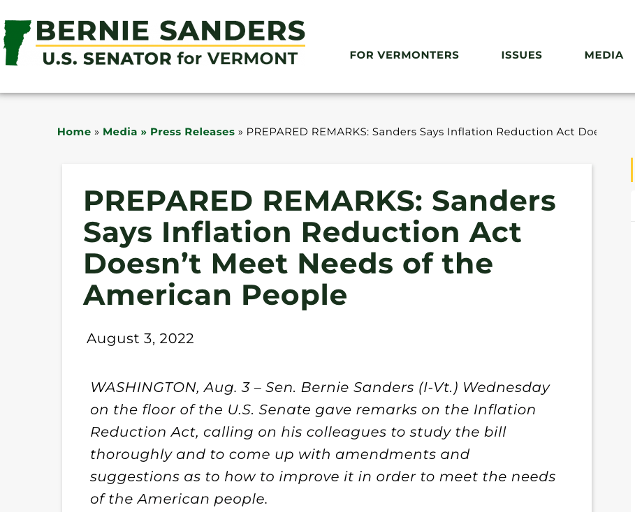 所以,桑德斯并没有公开承认《降低通胀法案》没用,他是认为应该在此基础上通过修正案,让此法案得到更进步的效果。