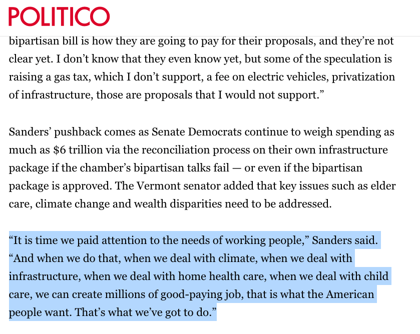 在《重建更美好法案》仍在协商的时候,2021年6月,桑德斯就表达过法案应该更加关注工薪阶层。