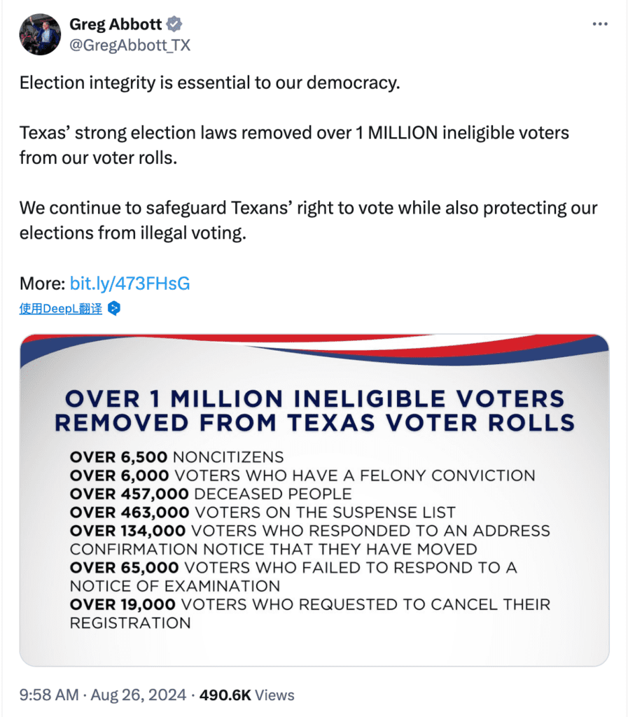 在本文中,我们重点聊聊这条推文的下半部分,即所谓德州2024年剔除了100万不符合资格的选民。