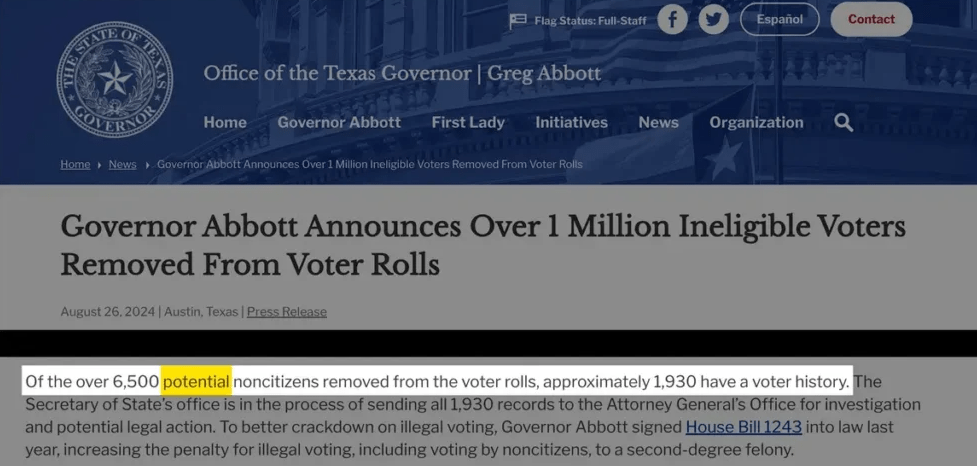 阿博特的新闻稿重点仍然是非公民投票。他最初在新闻稿中表示,查出了6500名非公民,这些人当中有略少于三分之一的人在德州有某种投票历史。