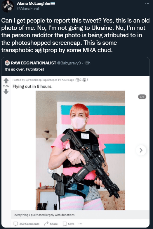 麦克劳克林解释:“这完全是防御性的。”她补充说,她武装自己是为了防止“不断升级的右翼威胁”。麦克劳克林说,这张照片曾在别的地方被滥用,包括在一个谎称她是一名在乌克兰作战的士兵的帖子中。