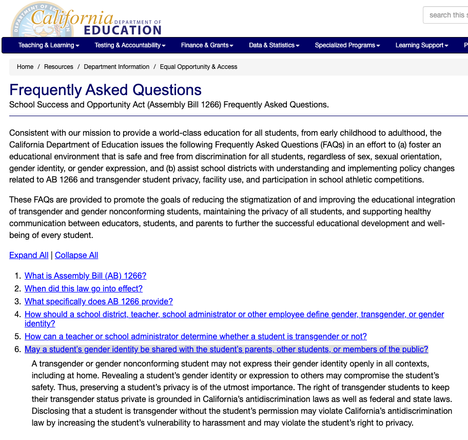 加州教育部在被原告提及的加州教育法221.5 (AB1266) 在问答页面详细地回答了“学生的性别认同是否可以与学生的家长、其他学生或公众分享”这个问题。
