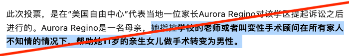 仔细一看,原报道全文没有任何涉及到“手术”的用词。“顾问给学生做手术变性”这个说法纯粹是微信公众号捏造的。根据美国自由中心描述这起案件使用的措辞,学校顾问给雷吉诺的女儿采用“社会性转变”(socially transition),即比如学生在学校可以使用新的名字和新的人称代词。此案根本不涉及“手术”,也不存在有任何医学上的性别转换治疗。
