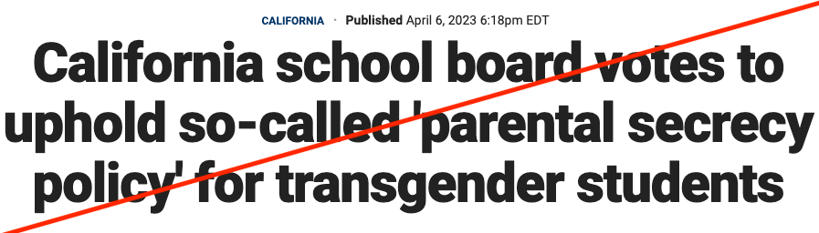 这条新闻的标题具有误导性,事实上加州教育部和奇科市校区从来没有过“家长保密政策”,也不存在维持所谓的保密政策。文中提到的诉讼,并没有提到“变性手术”,而是学校顾问为学生采取“社会性转变”,比如使用新的人称代词。微信公众号无中生有,将此描述为“顾问在家长不知情的情况下为孩子实行变性手术”,显然不符合事实。
