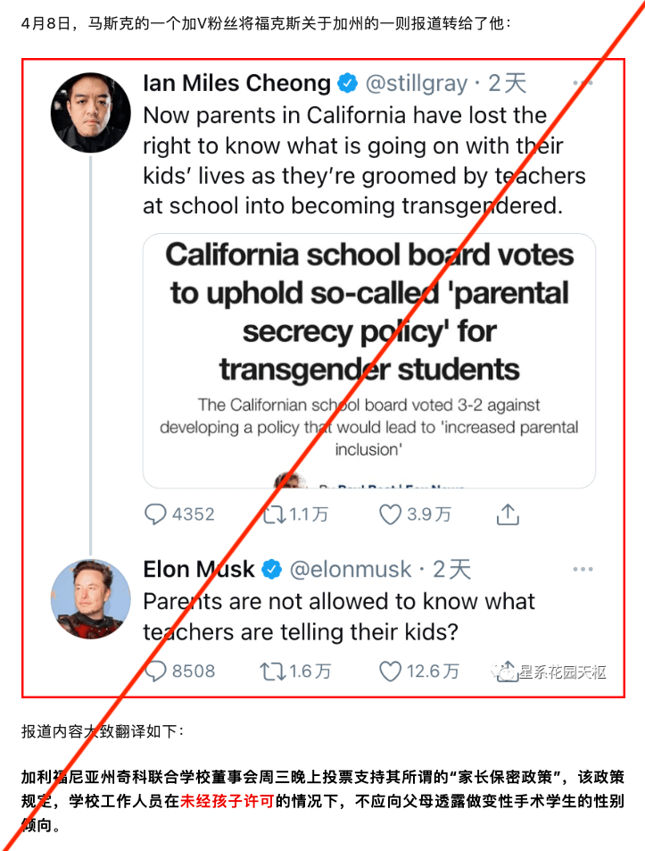 至于微信文章中谈到的马斯克针对此事的回应,显然也不符合已知事实。原推截图了福克斯新闻的标题并写道“现在加州的家长失去了知道孩子生活的权利,老师们诱导孩子去转换性别。”,马斯克回复到:“家长不被允许知道老师对孩子们说什么了?”