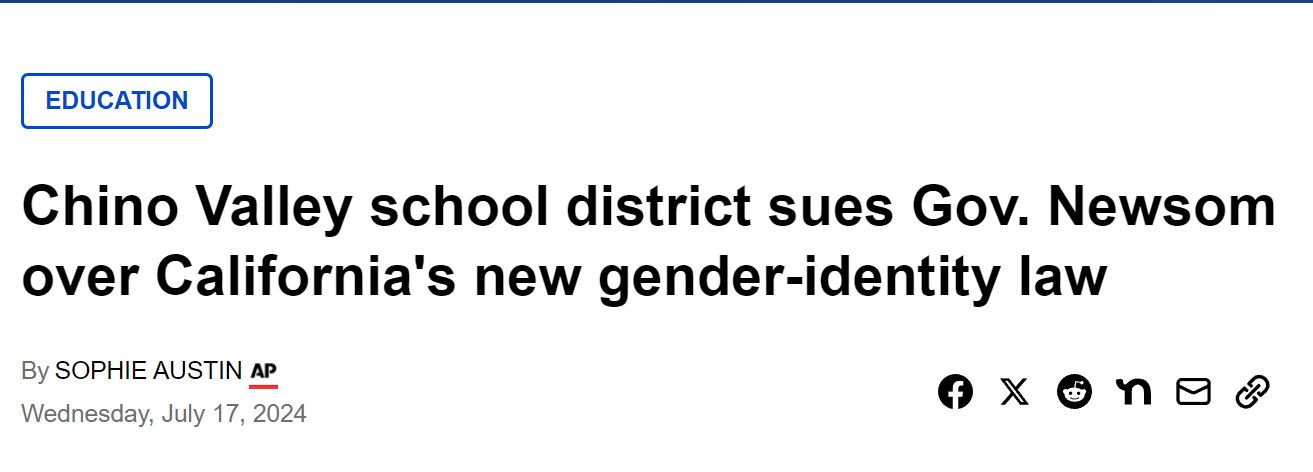 在加州宣布通过该法案后,奇诺谷联合学区起诉州长纽森和加州教育局长瑟蒙德(Tony Thurmond)。