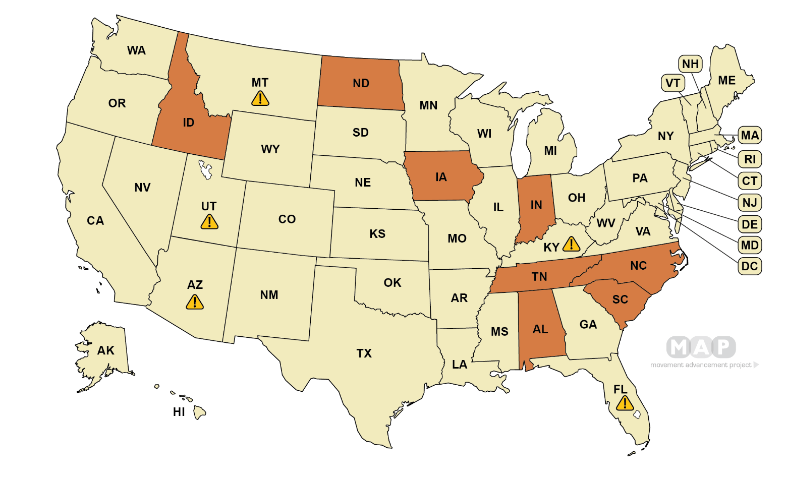 据非营利性智库和平等倡导者“运动推进项目”(Movement Advancement Project)称,目前有八个州 — — 爱达荷州、北达科他州、爱荷华州、印第安纳州、田纳西州、北卡罗来纳州、南卡罗来纳州和阿拉巴马州 — — 已通过法律,要求学校工作人员强制“出柜”跨性别学生。另外五个州 — — 蒙大拿州、犹他州、亚利桑那州、肯塔基州和佛罗里达州 — — 则通过了相关立法,鼓励但并不强制学校将相关信息告知家长。