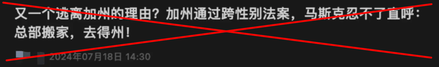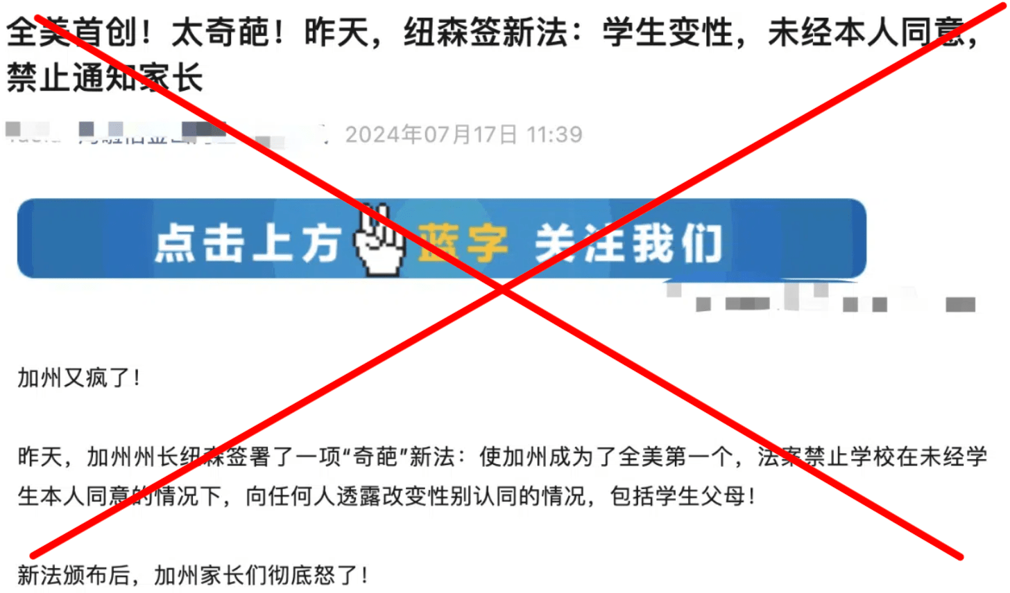 回到AB1955法案本身。该法案通过前后,在社交媒体上被一些右翼人士,或者一直对加州法案存在偏见,或者致力于抹黑的人士恶意解读。一位用户6月16日在一段Instagram视频中称,该法案“允许学校在您不知情且未经您同意的情况下,秘密、在社会上甚至通过医学手段让您的孩子变性”。
