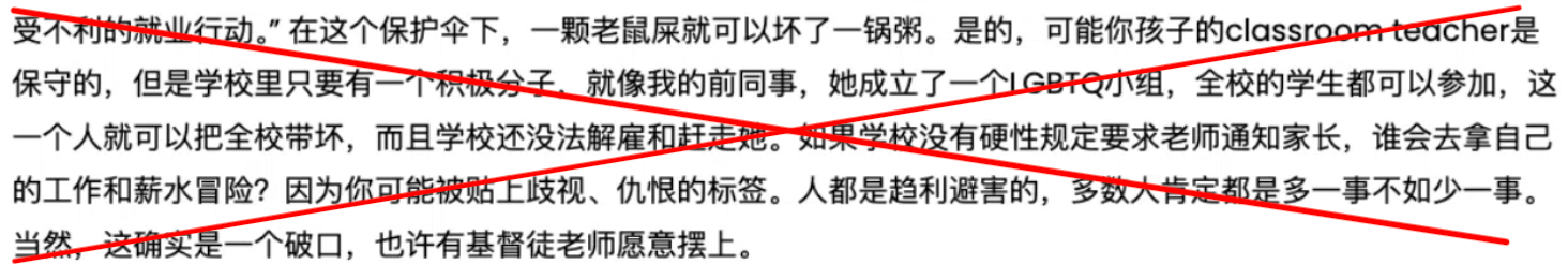 中文自媒体的指责,往往是基于猜测和滑坡理论:因为保护隐私,所以做不被允许的事也会被鼓励,“一个人可以把全校带坏”。阴谋论者认为,性取向是可以被“教唆者带坏的”。潜台词就是LGBTQ是不好的,而且是可以被后天和环境改变的。