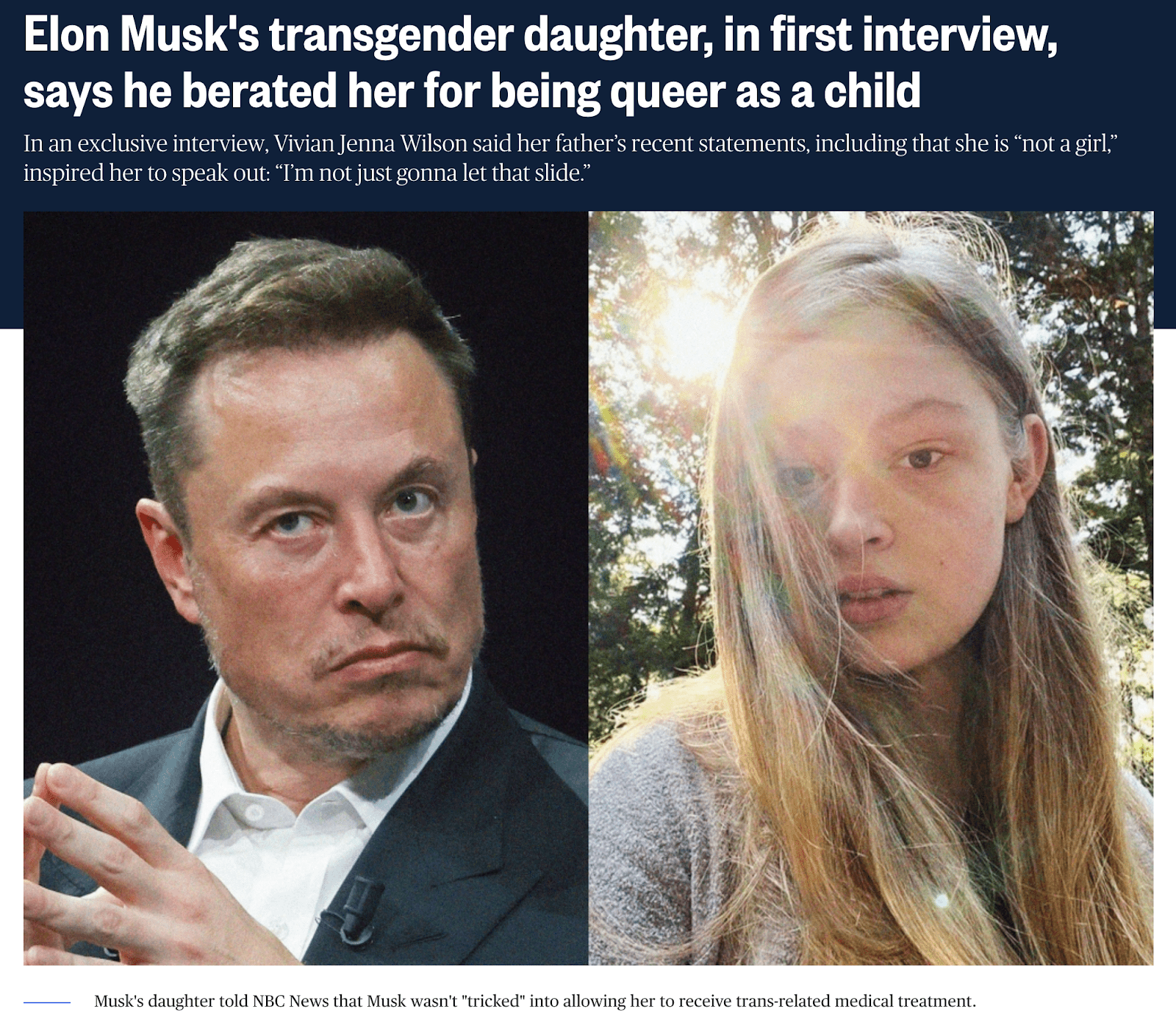 威尔逊表示,马斯克并没有被骗,在最初犹豫后,他在充分知情的情况下同意她使用激素替代疗法,她从16岁时确诊患严重性别焦虑症,开始服用青春期阻断剂。威尔逊指责育有12个子女的马期克管生不管养,完全不在自己或其他兄弟姐妹的身边,也向来不了解自己,而在她十来岁表现出女性特质时,比如声音尖细时,她遭到了父亲“无情的骚扰”和“恶狠狠的咒骂”,包括被父亲逼着把声音放得更低沉。