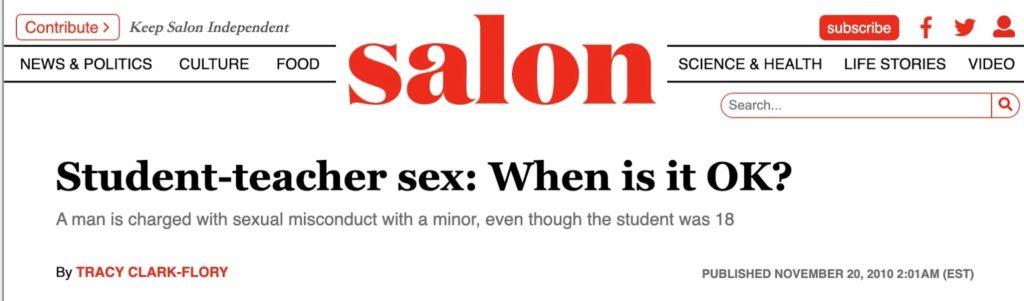 罗斯在那条十年前的简短推文里并没有回答自己的问题,只是链接到了Salon网站的一篇新闻报道,这篇报道介绍的是华盛顿州一名33岁的高中合唱团教师因与一名18岁学生发生性关系而被捕,之后出现的法律问题。