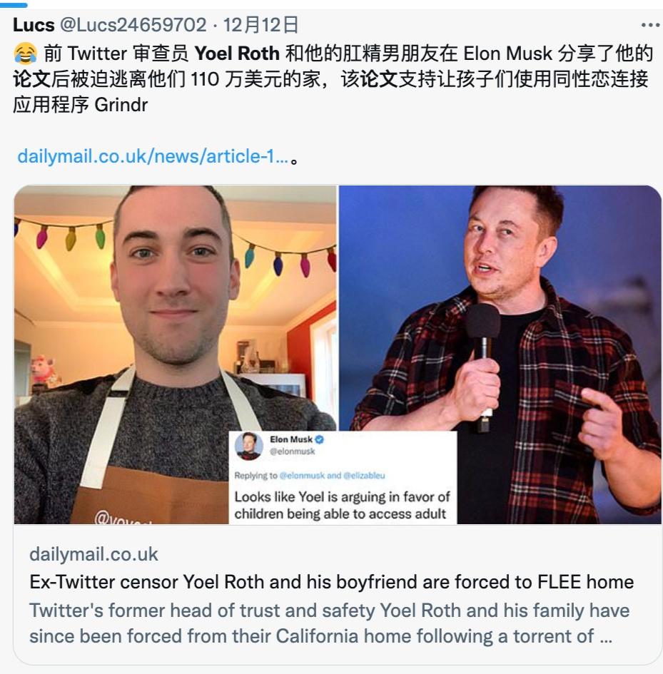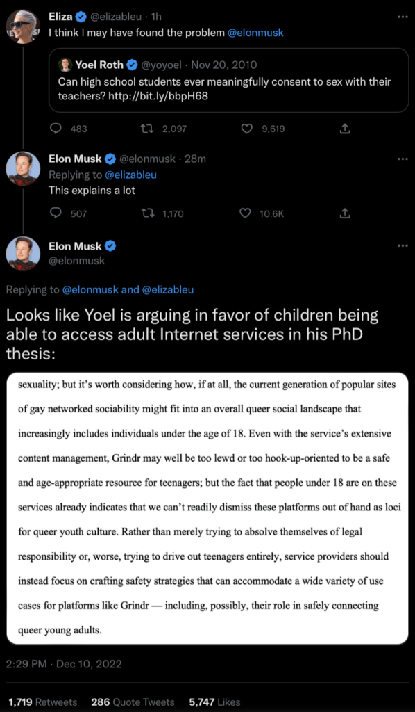 在后续推文中,马斯克又引用了罗斯一篇研究生论文的一部分。他写道:“看起来约尔在他的博士论文中支持儿童能够使用成人互联网服务。”就这样,通过引用一篇300多页论文中的一段文字,以及一个完全没有表达态度的问句,马斯克认为他找到了推特儿童性侵内容泛滥的罪魁祸首。