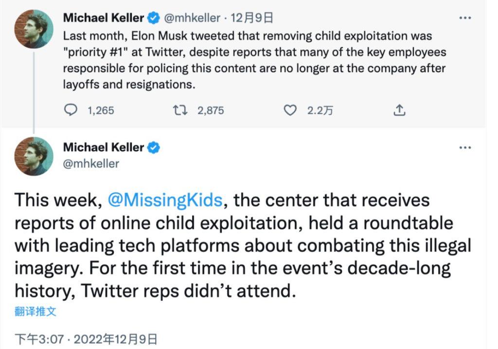 虽然推特的员工人数仍在变化,但NBC新闻和CNBC获得的内部记录显示,截至12月初,该公司约1600名员工中,约有25名员工持有与“信任与安全”相关的头衔。一名从事儿童安全工作的推特前员工对NBC新闻表示,他们知道公司里有“少数”人仍在处理这个问题,但之前团队里的产品经理和工程师大部分或全部都不在了。
