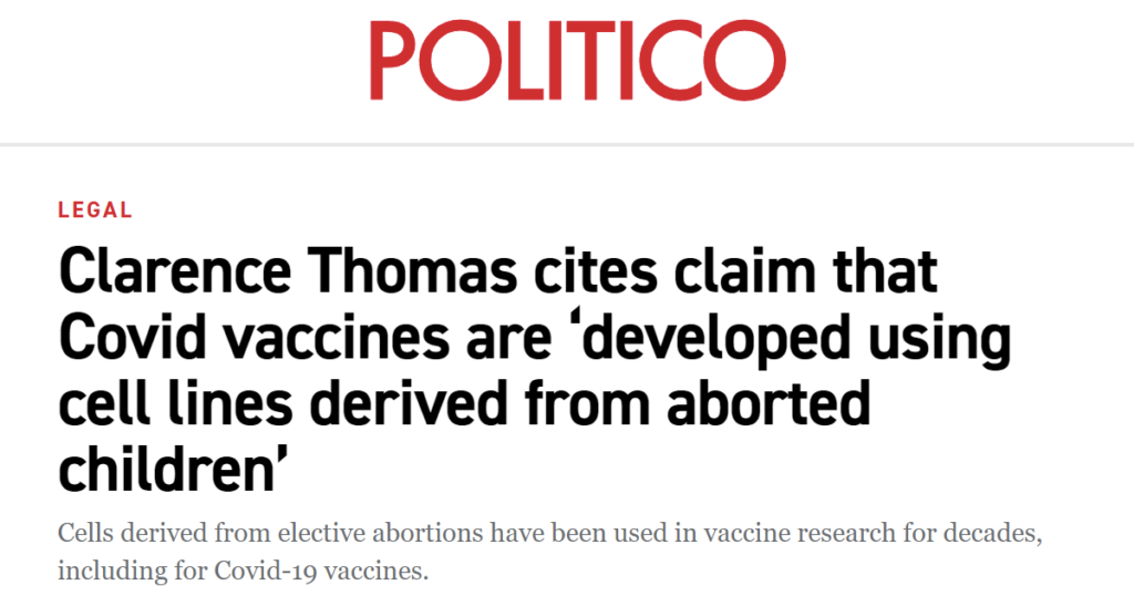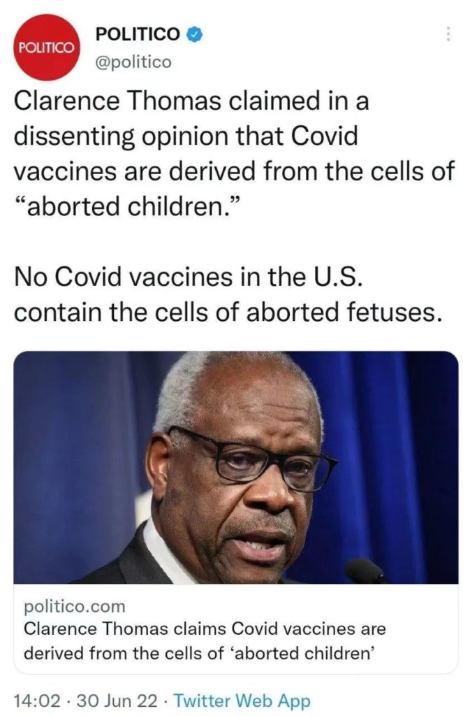 美国政治网站Polictico,6月30日发文和发推说。最高法院大法官托马斯(Clarence Thomas)在一个反对意见书上声称新冠疫苗是通过堕胎的婴儿细胞系(cell lines)制造的。然后该推特称在美国的新冠疫苗没有堕胎的胎儿的细胞。