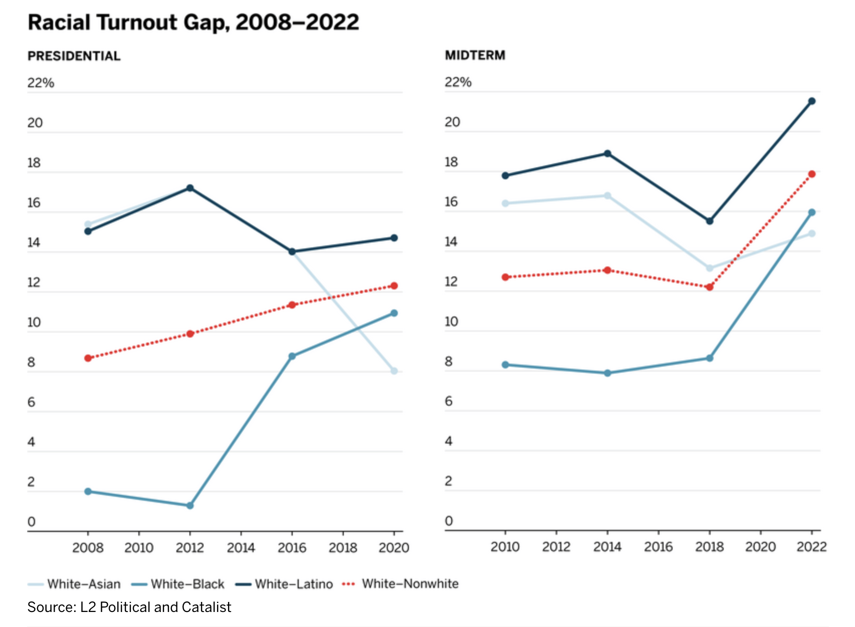 以上图表显示了令人担忧的趋势,在2008年至2022年之间,白人和非白人投票率的差距是持续增大的(上图红色虚线),特别是2018年和2022年中期选举的差异更是迅速拉大了6个百分点(右图),这说明相对于白人的投票率,非白人的投票率在持续下降。
