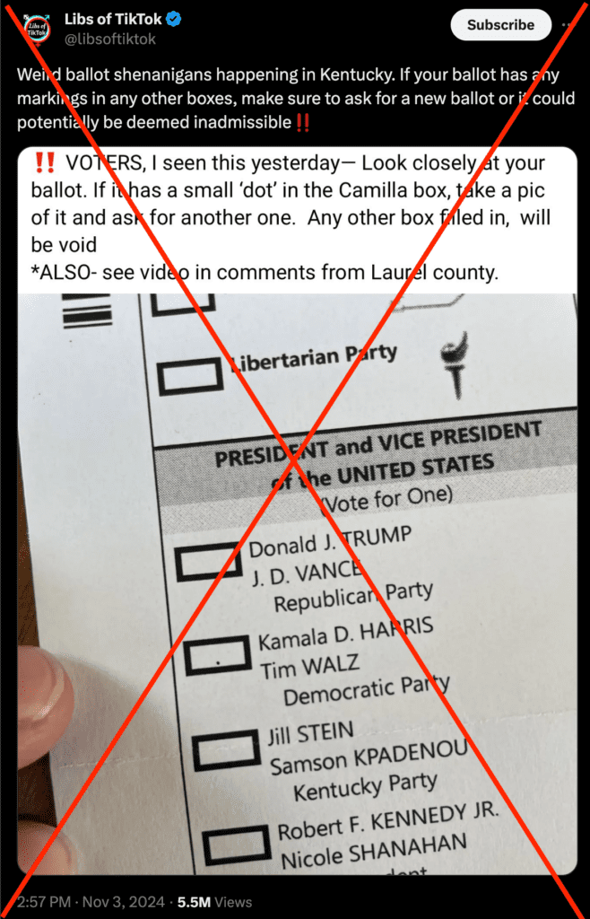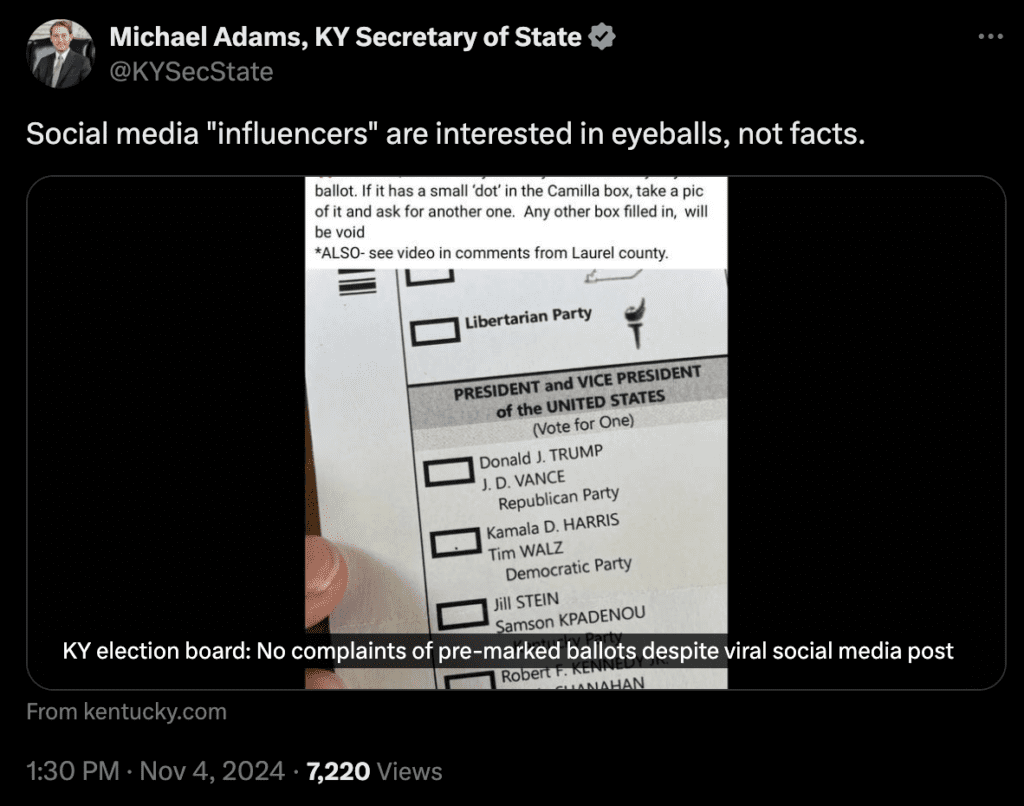 该贴子说:“肯塔基州发生了奇怪的选举欺诈事件。如果你的选票在任何候选框有标记,确保要求新的选票,否则选票可能不被认可。” 该帖子有超过550万浏览。