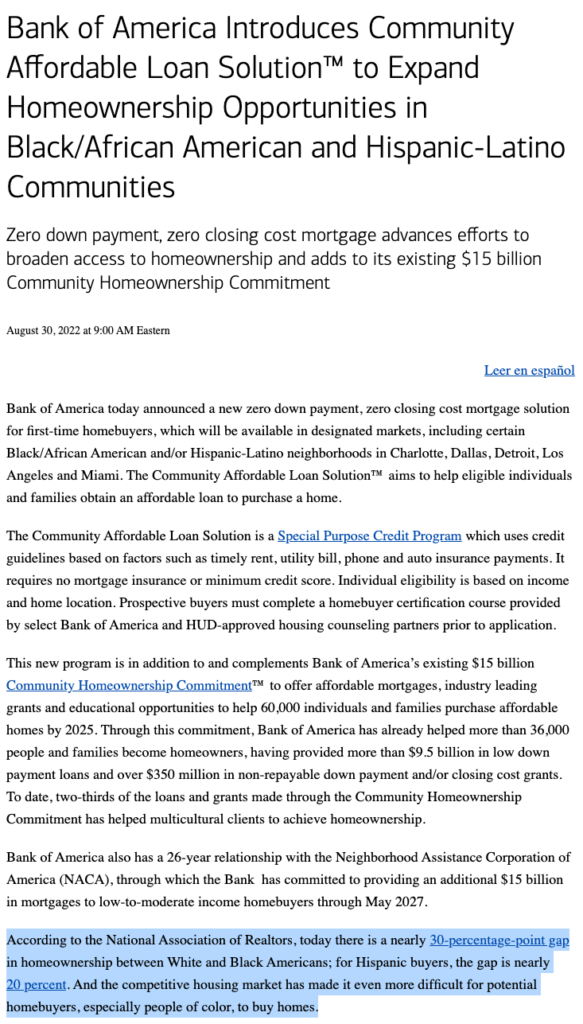 美国银行(Bank of America)于8月30日公布试点计划的新闻,该计划将在指定市场(包括夏洛特、达拉斯、底特律、洛杉矶和迈阿密的某些非裔和或西班牙裔社区)提供一项针对首次购房者的零首付、零过户费用的抵押贷款方案。